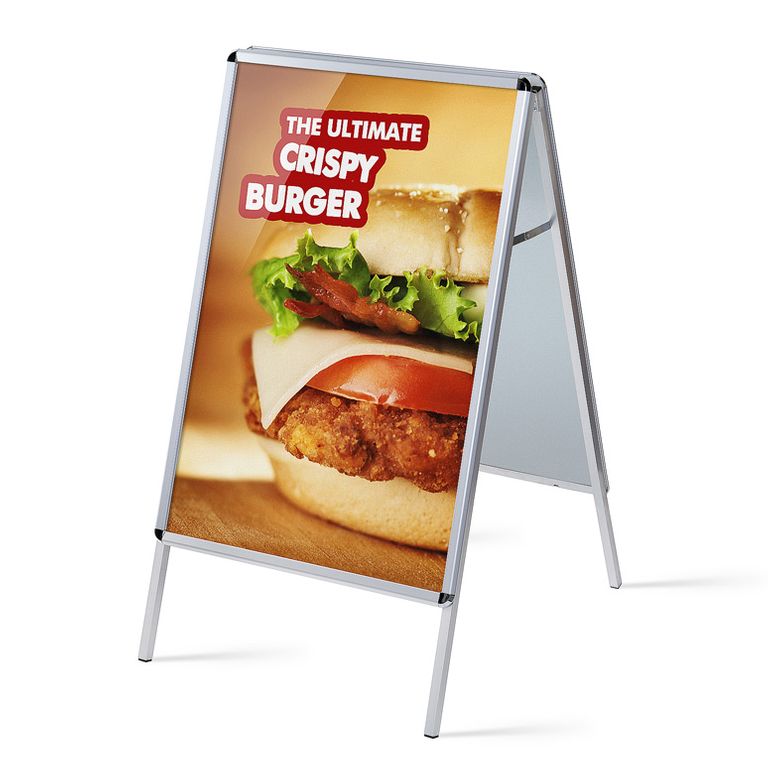 Doppelseitiger, extragroßer Kundenstopper mit Aluminium-Klapprahmentechnik, 32 mm- Profil, silber eloxiert in EV1/E6, Ecken abgerundet (RONDO). Wetterbeständiger Plakatständer mit integrierten Wasserablauflöchern und UV-stabilisierter Antireflex-Posterschutzfolie. Mit Metallrückwand und pressblanken 25x25 mm Standprofilen.