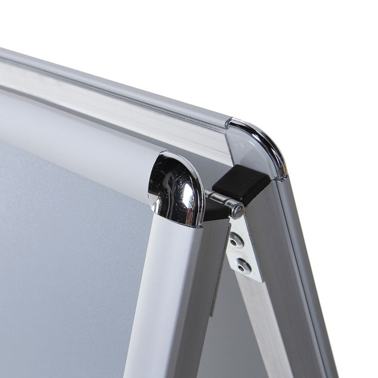- die Federn zum Öffnen und Schließen der klappbaren Rahmenelemente sind aus hochwertigem Federstahl, nicht aus günstigerem Blech. So bleibt der Plakatständer auch bei häufigem Plakatwechsel funktionstüchtig und schließt an den Seiten bündig mit den Folien zum besseren Schutz Ihrer Plakate.