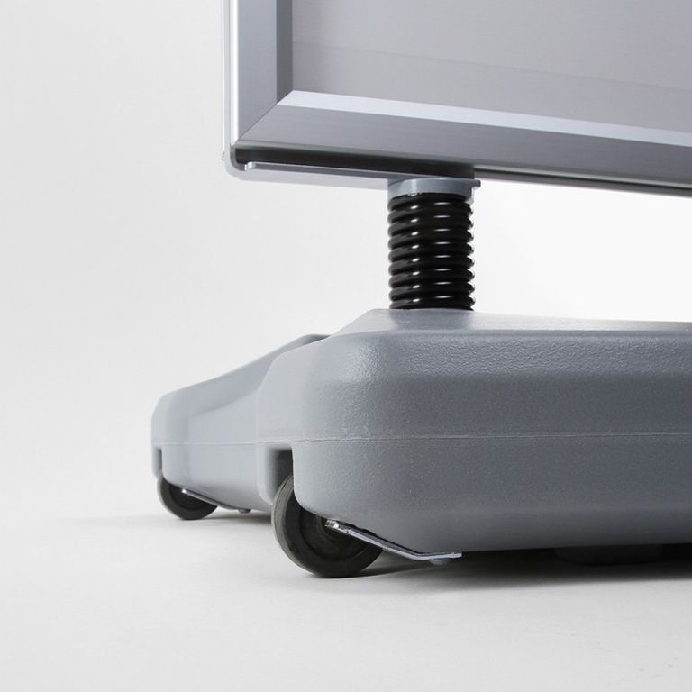 Robuster doppelseitiger und windfester Kundenstopper DIN A0 zum attraktiven Preis, mit Aluminium-Klapprahmentechnik, silber eloxiert in EV1/E6. Spezielle Kunststoffecken für maximale Sicherheit vereinfachen die Handhabung. Windfest und wetterbeständig mit UV-stabilisierter Antireflex-Posterschutzfolie. Mit Wasser oder Sand zu füllendes Gewicht als Standfuß. Die Spezialfedern aus Stahl gewährleisten hohe Standfestigkeit auch bei hohen Windgeschwindigkeiten. Durch integrierte Rollen an der Unterseite ist der Ständer leicht zu transportieren. Zusätzliche Metallprofile an der Unterseite schützen den Plakatständer DIN A0 vor Beschädigung durch Scheuern beim Transport und erhöhen so dessen Lebensdauer.